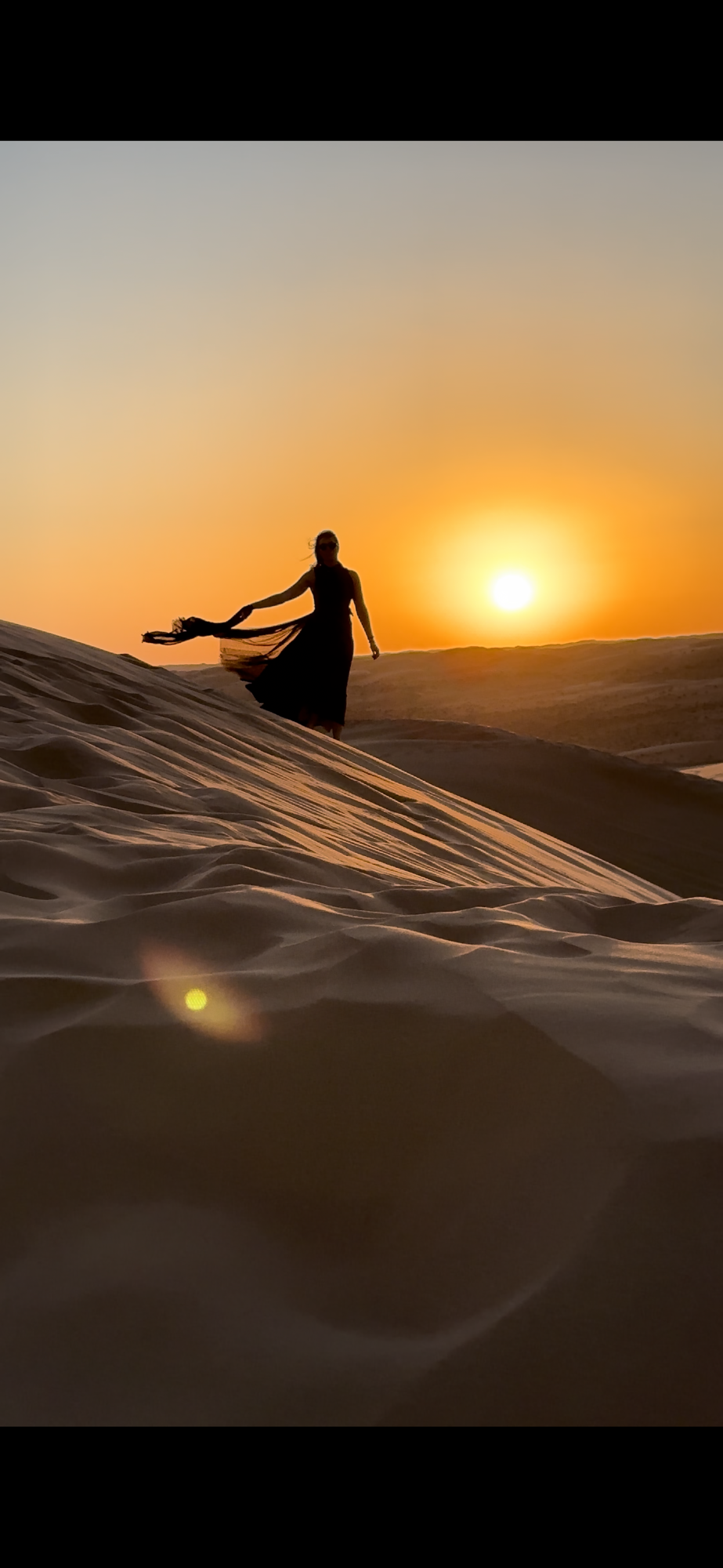 We left the Wadi and headed a few hours into the desert into Wahiba Sands. There was a little ‘tent city’ I stayed at. It took glamping to a new level! These air-conditioned tents with showers, toilets, and amazingly comfortable beds. I walked out to the dunes for sunset which was the most amazingly beautiful sunset with the most wild colors of orange. I got one of my best LBD (long black dress) photos to date there! I had an experience like this in Morocco too – I highly recommend staying at least a night in the desert and climbing the dunes, riding camels. It’s such a special experience.